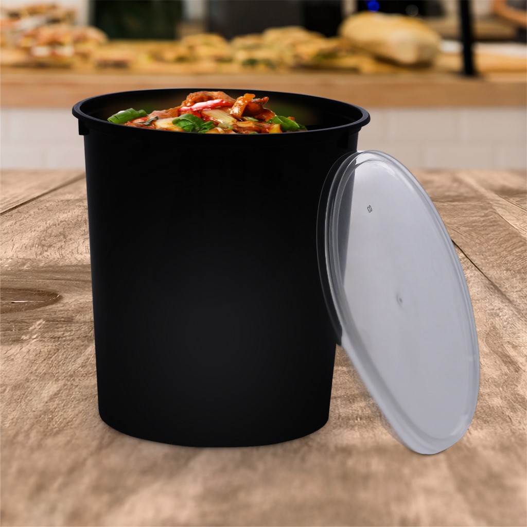Lunch ready in minutes. Offering a high-quality design, the Packwell round microwave container with clear lid ensures convenience and hygiene. This set includes 200 pieces, each with a 1000-ml capacity, and allows you to pack, store, or reheat your favourite food easily. This microwavable container is constructed of high-quality BPA-free and food-grade materials, ensuring your safety and prioritising your health. With its anti-bacterial and anti-fungal properties, food will remain fresh and free of bacterial or fungal growth. In addition to providing a safe way to pack orders for restaurants or caterers, these containers are very useful for busy people who prepare meals in advance. Plus, the black containers with matching lids make it easy to keep things covered. The clear lid allows you to monitor the contents inside. Microwavable containers are also odour-proof at any temperature and do not release pungent smells while reheating. The round containers have a compact and stackable design, making them easy to store and saving valuable space in the kitchen or fridge. Made from the highest quality materials, this microwave container with lid is a versatile and reliable investment to meet your requirements.