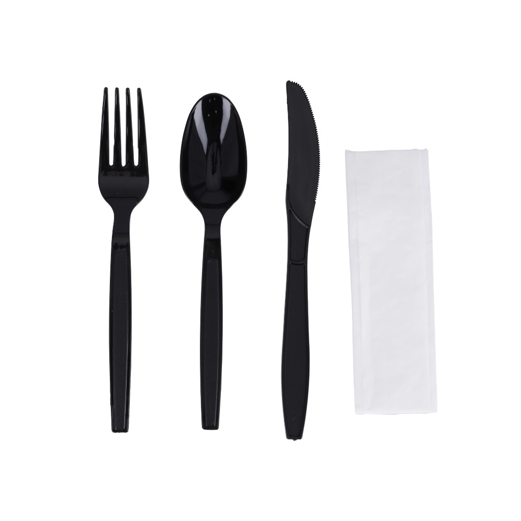 Perfect combination of aesthetics and performance. Offering a high-quality design, the Packwell black HD 4-in-1 cutlery set offers exceptional durability and functionality for various needs. Made from premium-quality, BPA-free, and food-grade materials, this plastic cutlery set is safe and hygienic. The black HD set includes a spoon, fork, knife, and napkin. Each set weighs only 4.0 grams, making them light in weight, convenient to use, and large enough to hold a reasonable amount of food. The set has everything you need for a complete dining experience and is commonly used for packing, takeout, catering, large gatherings, etc. The spoon, knife, and fork have comfortable and sturdy construction, which allows you to scoop, cut, and hold food easily. Additionally, the napkin is suitable for cleanliness. This pack contains 500 sets, so you’ll have enough to meet your needs. This plastic cutlery set is constructed of high-quality BPA-free and food-grade materials, ensuring your safety and prioritising your health. With its anti-bacterial and anti-fungal properties, food will remain fresh and free of bacterial or fungal growth. The cutlery set is also odour-proof at any temperature and does not absorb or retain odour from the food it holds. Their simple yet ergonomic design provides comfort. After use, dispose of the set responsibly. Made from the highest-quality materials, these black HD cutlery sets are a versatile and reliable investment for all your needs.