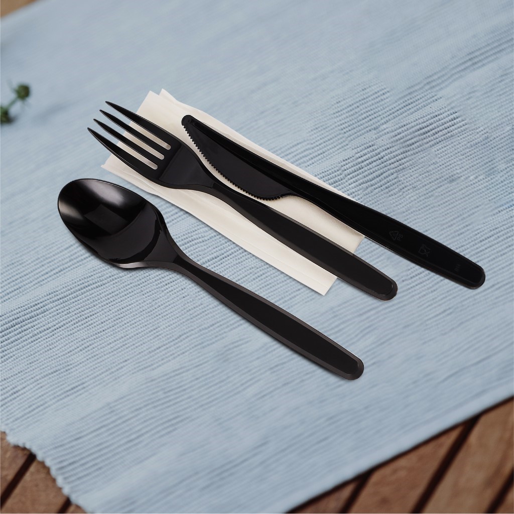 Perfect combination of aesthetics and performance. Offering a high-quality design, the Packwell black MD 4-in-1 cutlery set offers exceptional durability and functionality for various needs. Made from premium-quality, BPA-free, and food-grade materials, this plastic cutlery set is safe and hygienic. The black MD set includes a spoon, fork, knife, and napkin. Each set weighs only 3.2 grams, making them light in weight, convenient to use, and large enough to hold a reasonable amount of food. The set has everything you need for a complete dining experience and is commonly used for packing, takeout, catering, large gatherings, etc. The spoon, knife, and fork have comfortable and sturdy construction, which allows you to scoop, cut, and hold food easily. Additionally, the napkin is suitable for cleanliness. This pack contains 500 sets, so you’ll have enough to meet your needs. This plastic cutlery set is constructed of high-quality BPA-free and food-grade materials, ensuring your safety and prioritising your health. With its anti-bacterial and anti-fungal properties, food will remain fresh and free of bacterial or fungal growth. The cutlery set is also odour-proof at any temperature and does not absorb or retain odour from the food it holds. Their simple yet ergonomic design provides comfort. After use, dispose of the set responsibly. Made from the highest-quality materials, these black MD cutlery sets are a versatile and reliable investment for all your needs.